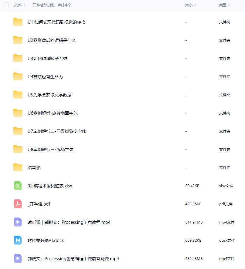 郭锐文Processing创意编程算法字体设计2023【画质还行有部分素材】 6小时前 平面设计 资源下载下载价格2 金币终身VIP免费立即购买如果充值购买遇到问题可以先联系客服的 qq:3460825861 如果下载链接失效请找客服补链或者留言 另外说明iphone用户请不要使用safari浏览器请用其他的浏览器 2 平面课程