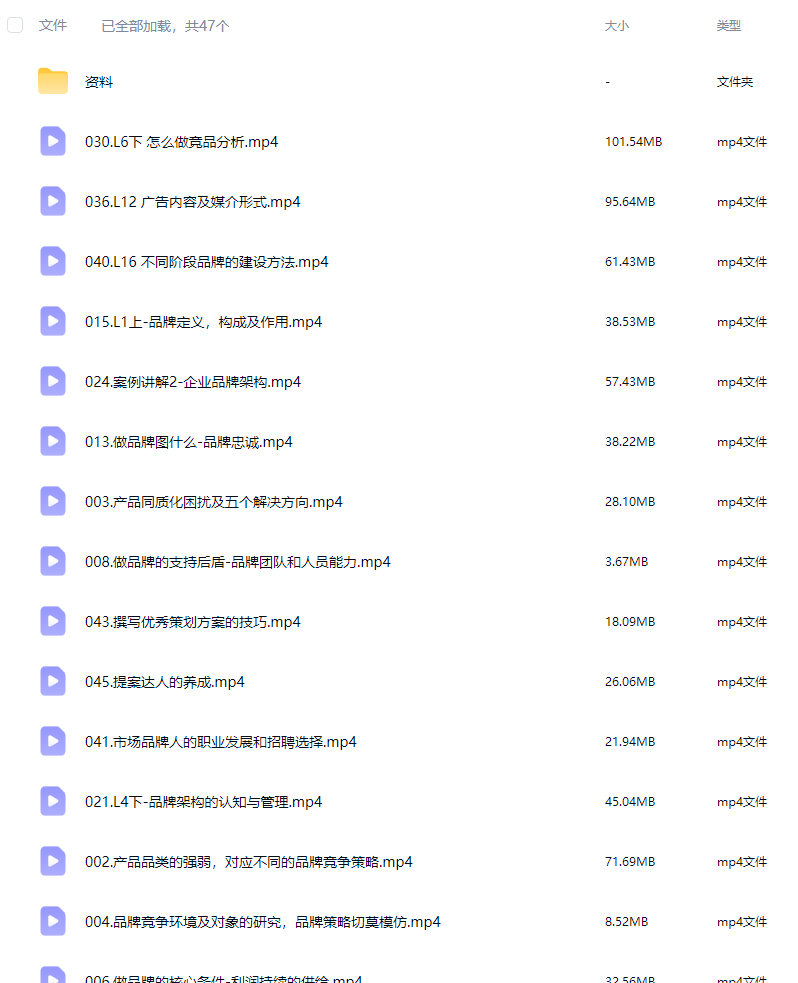 马克说品牌 品牌策划体系课程4.0版2024【画质高清有部分资料】 12小时前 平面设计 资源下载下载价格2 金币终身VIP免费立即购买如果充值购买遇到问题可以先联系客服的 qq:3460825861 如果下载链接失效请找客服补链或者留言 另外说明iphone用户请不要使用safari浏览器请用其他的浏览器 2 平面课程